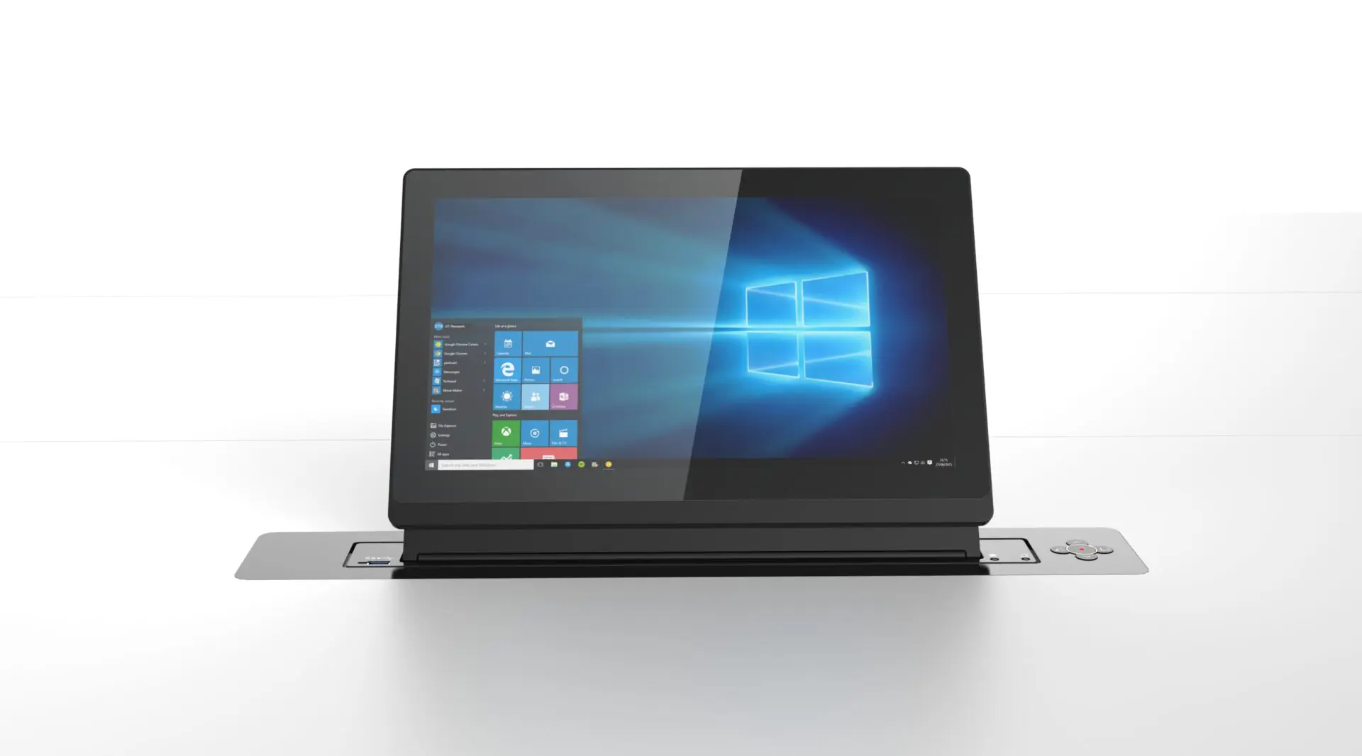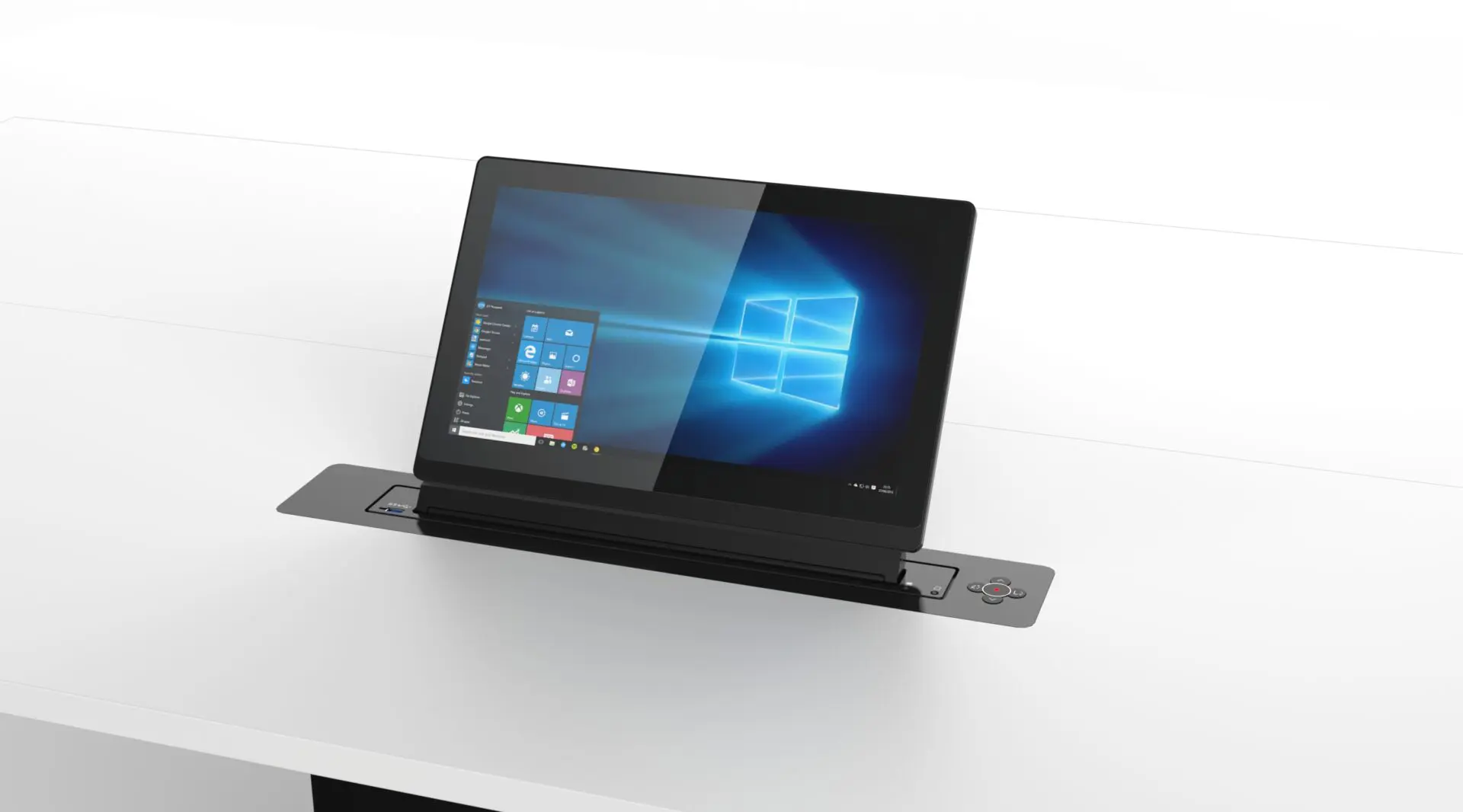 Motorlu monitör asansörü MV117H, tilt sürücü sayesinde 0-25° motorlu ayarlanabilir özelliği ile gömülü teknolojisini birleştirerek masaya rahatça gizlenebilmektedir.